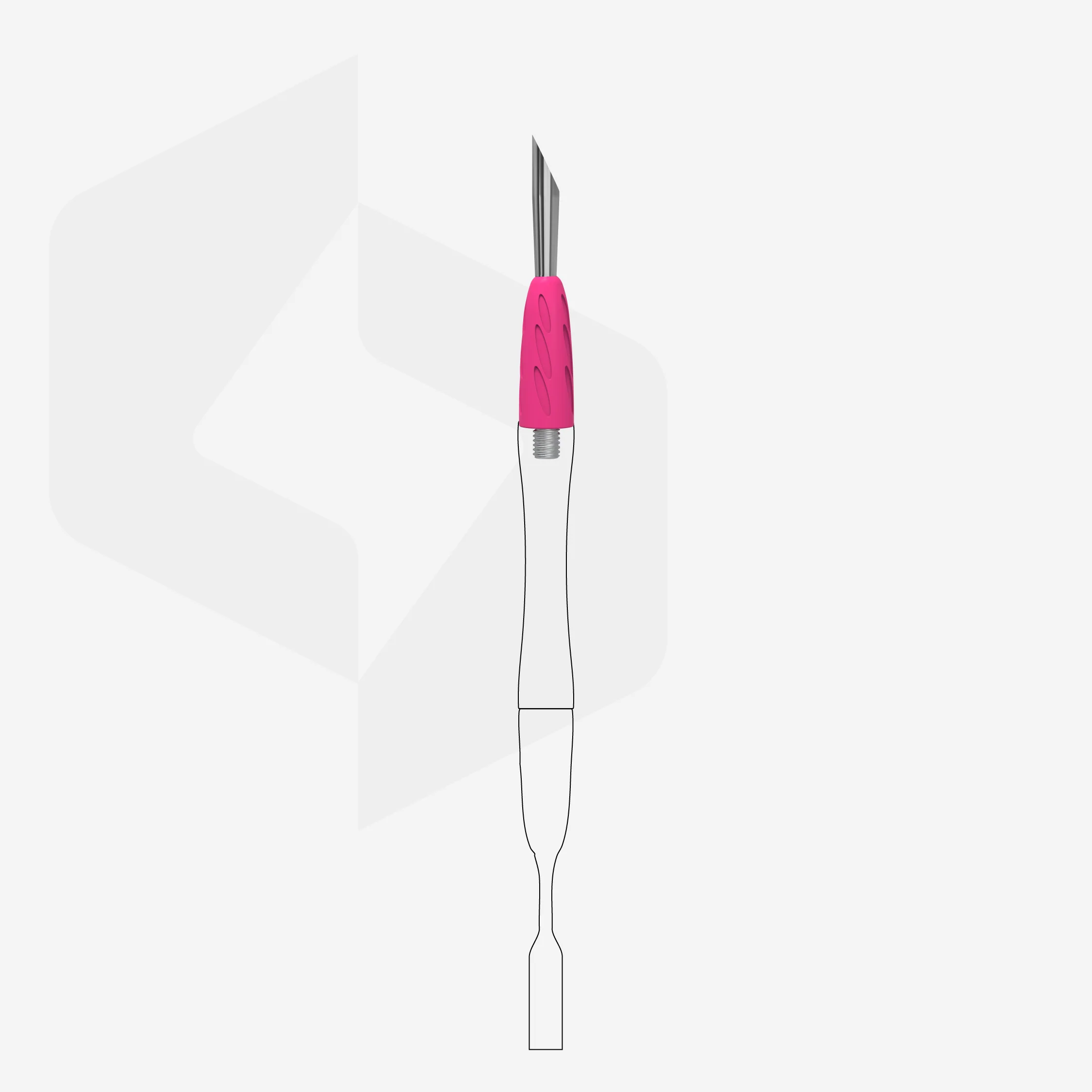 El “empujador biselado” con forma de palito de metal naranja está diseñado para levantar y empujar hacia atrás las cutículas muy adheridas y ásperas, limpiar el borde libre de la uña y eliminar el exceso de esmalte de gel durante la manicura y la pedicura.