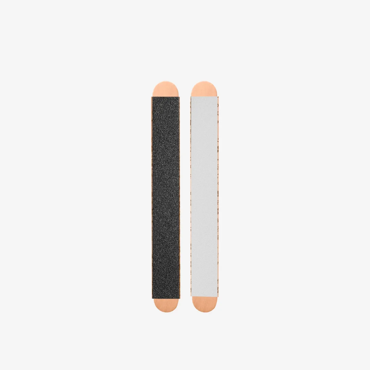 Son limas de doble cara sin adhesivo. Esto garantiza que la herramienta base quede limpia y sin restos de pegamento tras su uso, optimizando la desinfección.