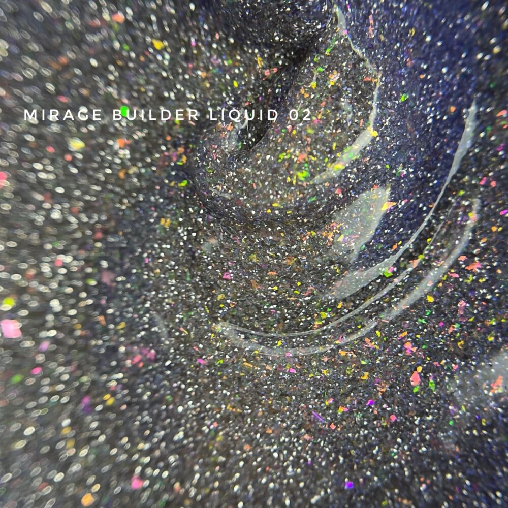 El BUILDER LIQUID MIRAGE es una simbiosis de gel constructor y base de camuflaje que contiene partículas reflectantes que crean un efecto de reflejo de luz.