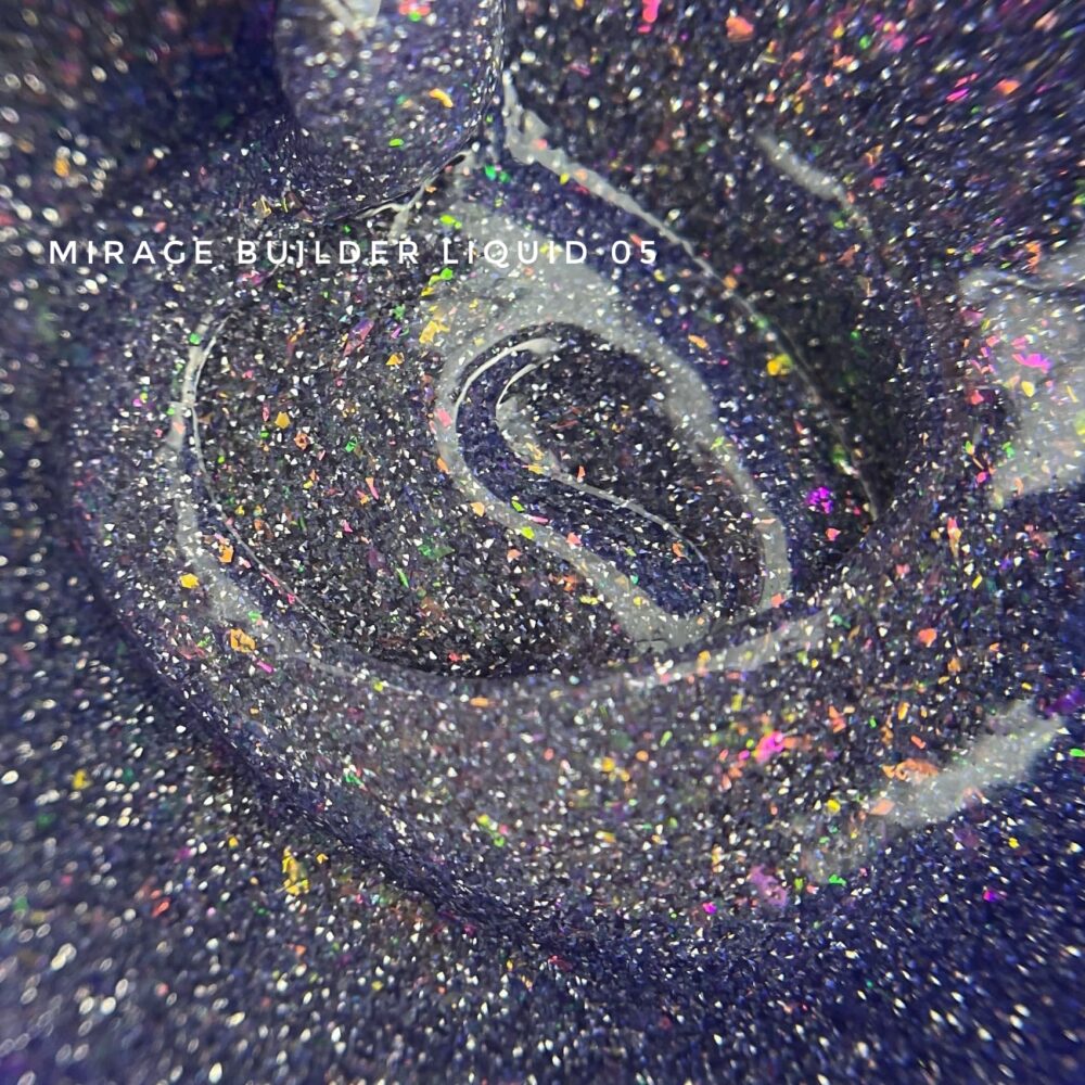 El BUILDER LIQUID MIRAGE es una simbiosis de gel constructor y base de camuflaje que contiene partículas reflectantes que crean un efecto de reflejo de luz.