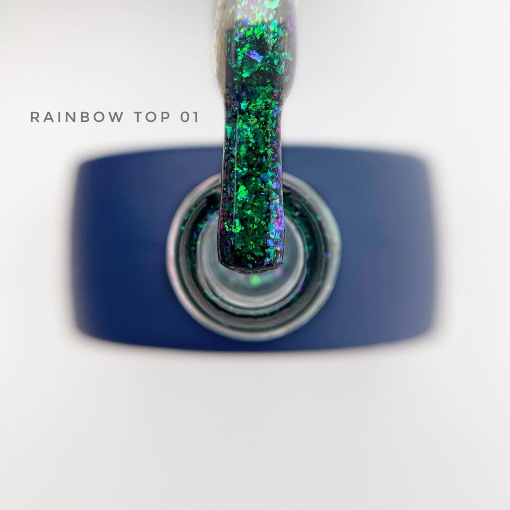 El TOUCH TOP RAINBOW es un top coat decorativo sin capa de inhibición (no-wipe) que contiene delicadas partículas “yuki” que crean un brillo iridiscente tipo arcoíris o escama de sirena.